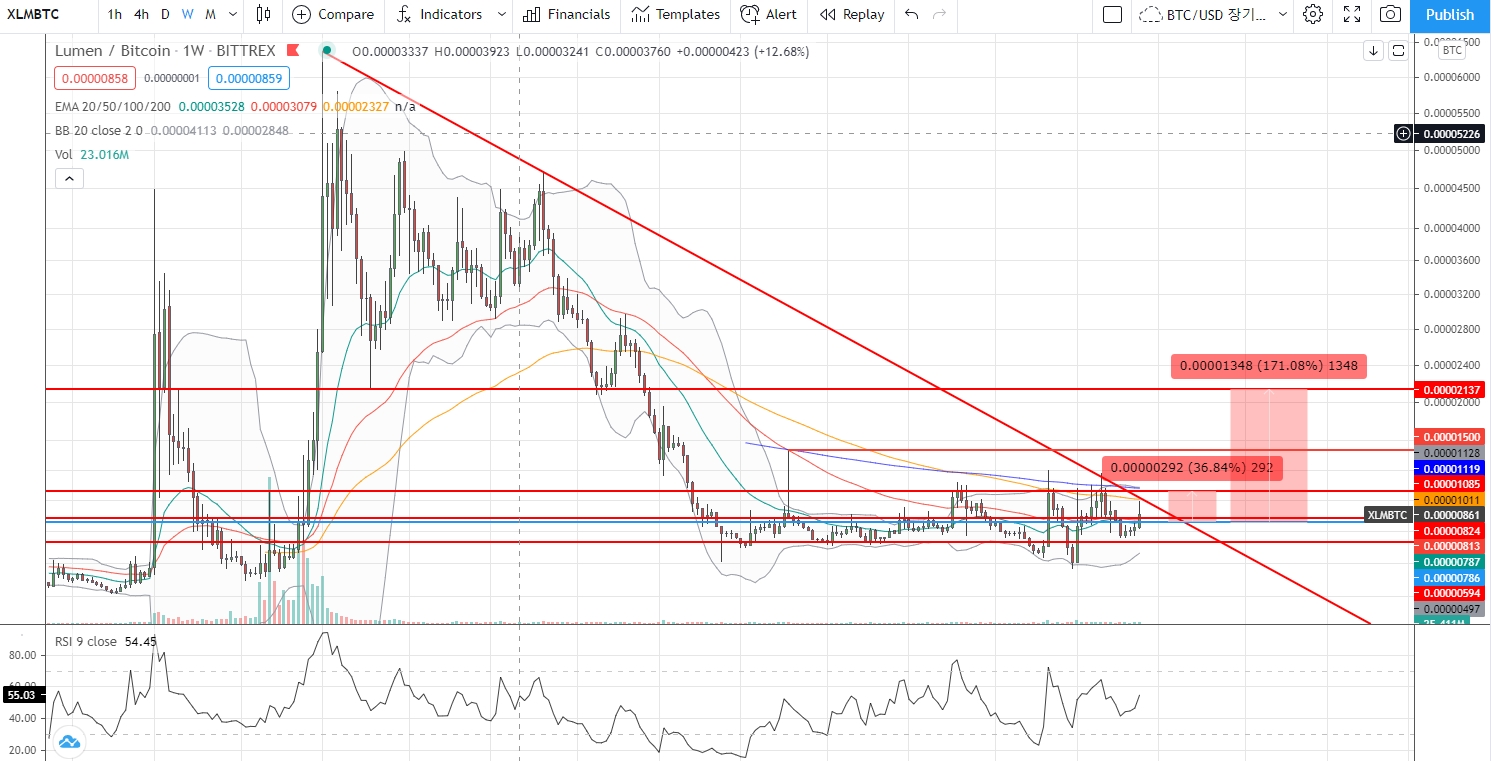 조만간 움직임일 줄지 좀더 매물을 소화할 시간이 필요할지 지켜볼만한 지점입니다. 현재 스텔라루멘의 지점이 매물대가 많은곳으로 매물을 녹이는데 시간이 다소 필요할 수도 있습니다. 차트상으로는 지금당장 오를거 같지만 인내심을 테스트하는 구간이 될 수 있음을 기억해야 합니다.