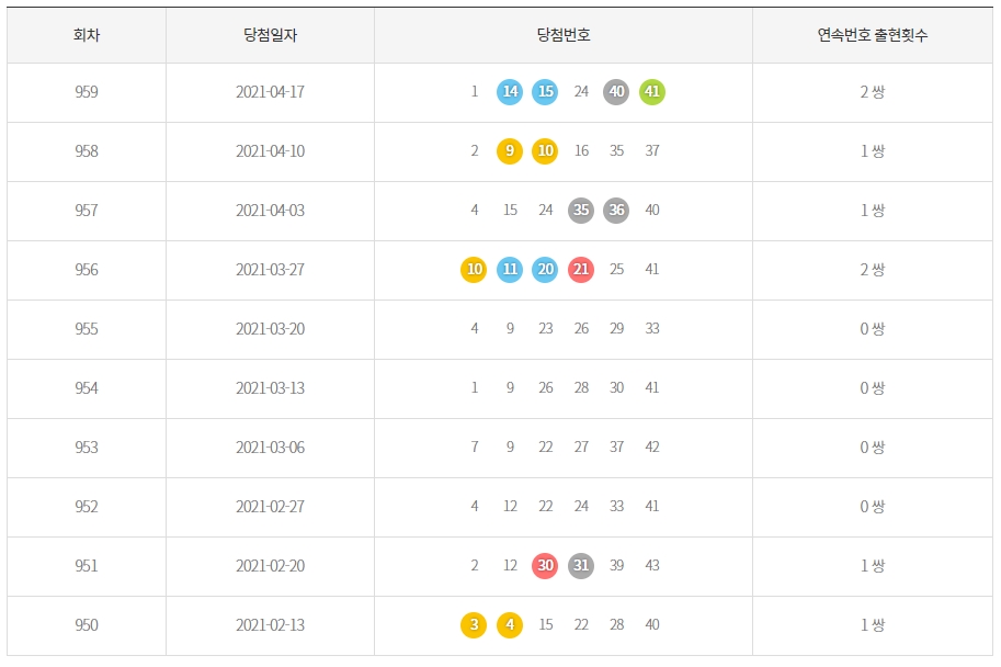 959회 당첨번호의 세자리나 2회 전차인 957회와 중복되어 나옴으로써 중복된 번호로 당첨이 된분들이 있을지도 모르겠습니다. 지난주와 마찬가지로 미출현번호가 동일합니다.