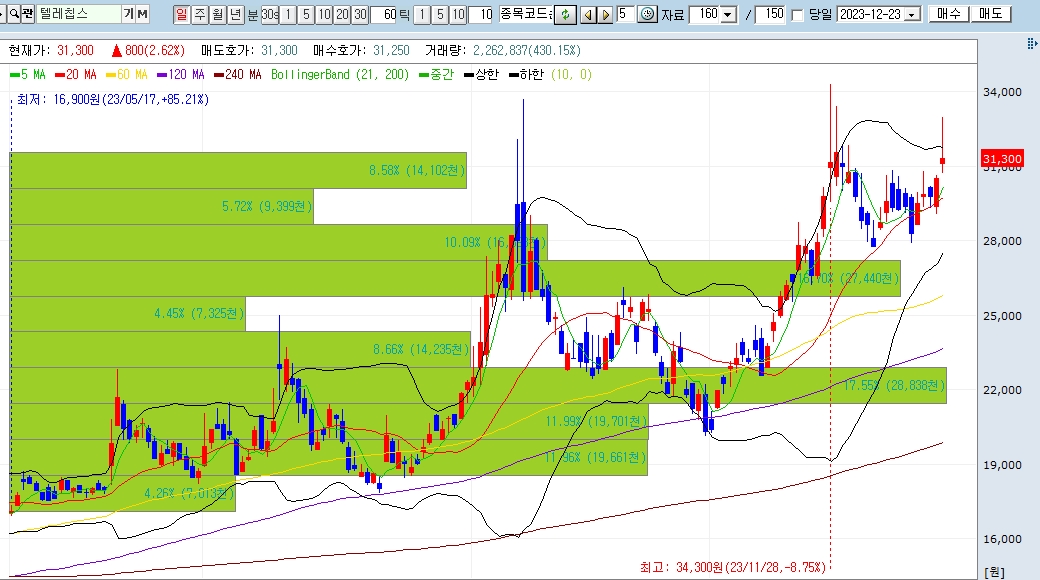 2024년 12월 22일 현재주가는 31,300 원이며 고점을 3번 확인후 조정받은 상태이다. 지분 8% 를 가지고 있는 칩스앤미디어와 주가추이가 유사하며 주요테마도 동일하다. 고점 갱신을 지켜봐야하는 자리라 신규로 진입은 부담스럽고 가격 조정후에 기회가 올때 진입하는것이 좋을듯 하다.